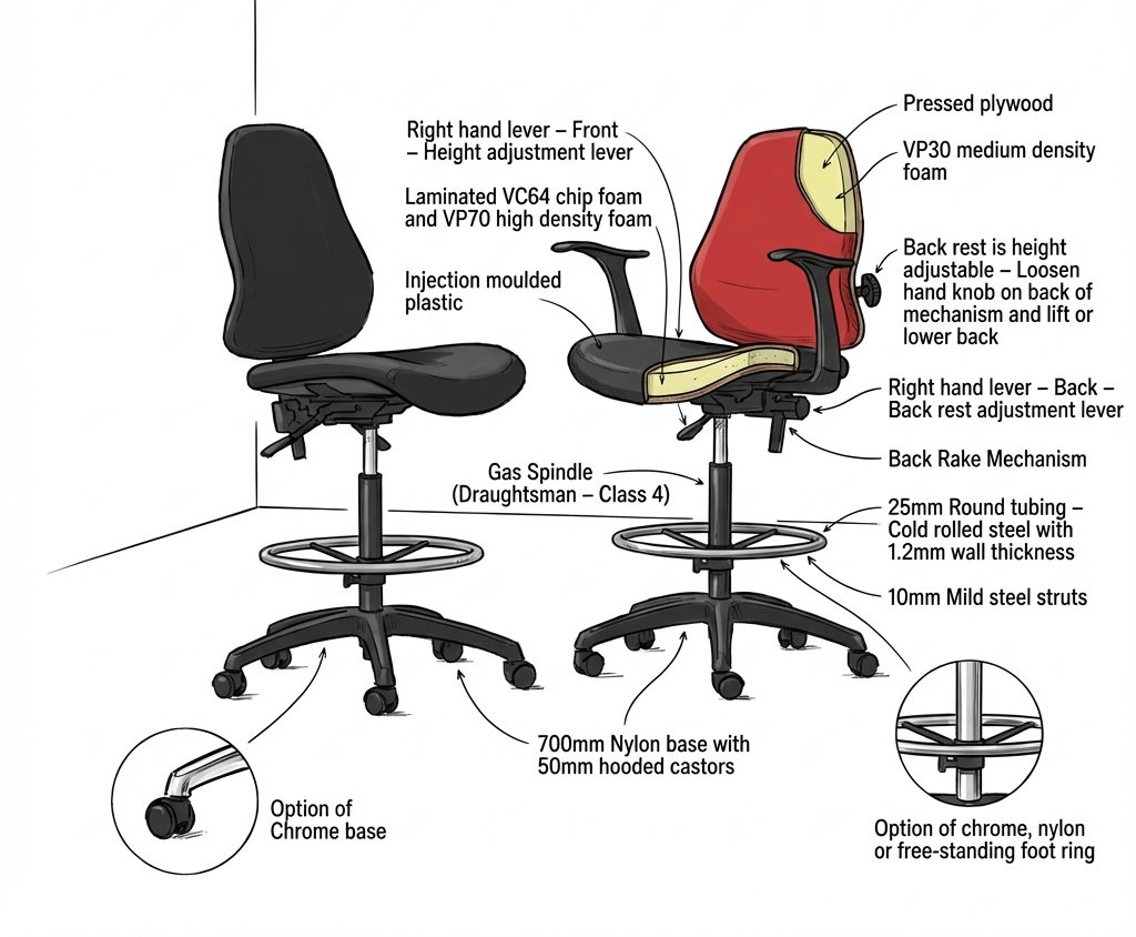 Base: 700mm Nylon base with 50mm hooded castors. Option of Chrome base.